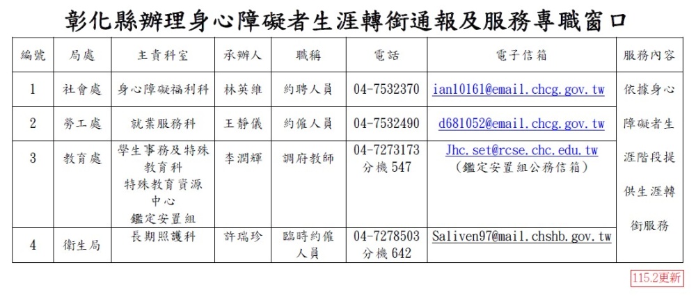 彰化縣辦理身心障礙者生涯轉銜通報及服務專職窗口